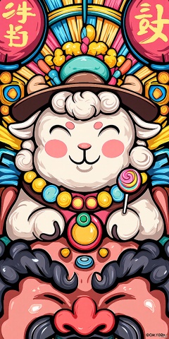 GCCH, A colorful, detailed digital illustration of a traditional Korean festival scene. A large, smiling sheep-like creature with curly white wool and a brown hat is the central figure, holding a lollipop. Surrounding it are various colorful, festive elements including a large, red, round face with exaggerated features, and traditional Korean lanterns. The background is filled with vibrant patterns and designs, creating a lively and festive atmosphere. The art style is whimsical and playful, with bold lines and bright colors.