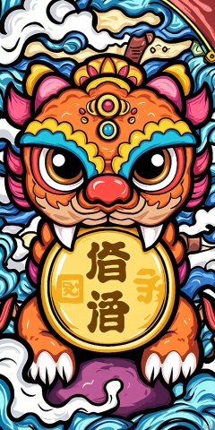 GCCH, A vibrant, detailed digital drawing of a Chinese dragon, featuring intricate patterns and bold colors. The dragon's head is adorned with red and gold decorations, including a prominent red gem at the center of its forehead. Its eyes are large and expressive, with a hint of mischief. The dragon's body is a mix of orange and yellow hues, with a prominent, round, gold coin-like structure in the center, featuring Chinese characters. The background is filled with swirling, cloud-like patterns in shades of blue and purple, giving the image a dynamic and energetic feel. The style is reminiscent of traditional Chinese art, with a modern digital twist.