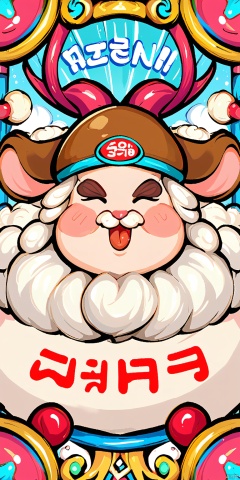 GCCH, A colorful, detailed digital illustration of a traditional Korean festival scene. A large, smiling sheep-like creature with curly white wool and a brown hat is the central figure, holding a lollipop. Surrounding it are various colorful, festive elements including a large, red, round face with exaggerated features, and traditional Korean lanterns. The background is filled with vibrant patterns and designs, creating a lively and festive atmosphere. The art style is whimsical and playful, with bold lines and bright colors.