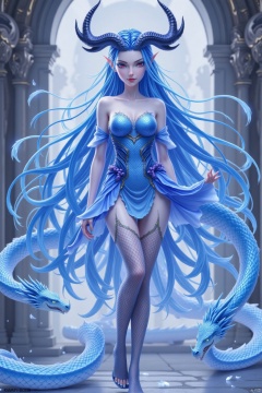 1girl, solo, long hair, breasts, looking at viewer, thighhighs, dress, bare shoulders, very long hair, blue hair, standing, full body, horns, pointy ears, covered navel, blue dress, fishnets, snake, dragon, scales, pillar