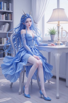 1girl, solo, long hair, breasts, looking at viewer, blue eyes, skirt, hair ornament, long sleeves, dress, jewelry, sitting, blue hair, full body, pantyhose, indoors, high heels, book, blue dress, chair, table, white pantyhose, blue footwear, lamp,ar1,风格滤镜