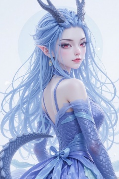 1girl, solo, long hair, breasts, looking at viewer, red eyes, dress, bare shoulders, jewelry, medium breasts, closed mouth, blue hair, tail, upper body, earrings, horns, pointy ears, from side, eyelashes, makeup, dragon horns, dragon girl, backless outfit, scales
