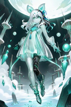 masterpiece, best quality, high quality, Icejade Acti \(ygo\), 1girl, solo, long hair, looking at viewer, hair ornament, green eyes, full body, white hair, colored skin, floating, see-through dress,