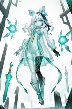 masterpiece, best quality, high quality, Icejade Acti \(ygo\), 1girl, solo, long hair, looking at viewer, hair ornament, green eyes, full body, white hair, colored skin, floating, see-through dress, necklace,