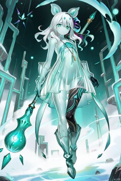 masterpiece, best quality, high quality, Icejade Acti \(ygo\), 1girl, solo, long hair, looking at viewer, hair ornament, green eyes, full body, white hair, colored skin, floating, see-through dress, necklace, holding staff,