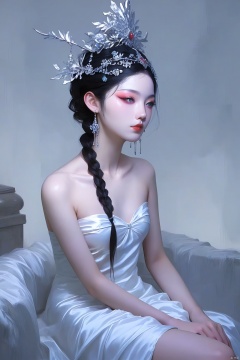 score_9 score_8_up score_7_up,1girl, solo, long hair, breasts, black hair,  dress, bare shoulders, jewelry, sitting, collarbone, braid, earrings, small breasts, indoors, white dress, lips, strapless, makeup, realistic, red lips