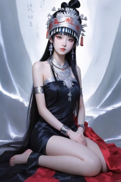 1girl, chinese ethnic minority costumes, long hair, looking at viewer, bangs, black hair, dress, bare shoulders, jewelry, sitting, very long hair, earrings, barefoot, necklace, black dress, bracelet, lips, bare legs, own hands together, armlet, stairs, realistic, red lips
