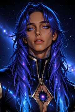 ((score_9_up, score_8_up, score_7_up)), 1boy,(male focus, boy, solo), galaxy irises, very long_galaxy_hair ((detailed eyes:1.1)), best quality, high resolution, 4k, perfect illustration, Beautiful eyes,(masterpiece, best quality, absurdres, highres), amazing quality, very aesthetic, brown_skin, dark_skin_male, Eyes,vibrant colors,dark skin,galaxy tattoos, tight_galaxy_clothing, detailed_space_background, galaxy man, reflection_galaxy, skin_galaxy, dark_atmosphere, semi_realistic galaxy