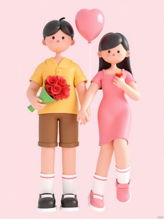3DYS, A 3D cartoon-style illustration featuring a young couple holding hands. The man on the left has short black hair and is wearing a yellow shirt, brown shorts, white socks, and black shoes. He is holding a bouquet of red flowers. The woman on the right has long black hair and is wearing a pink dress, white socks, and pink shoes. She is holding a small pink balloon in her other hand. The background is a solid light pink color. The couple is standing close together, facing the viewer. The illustration has a playful and whimsical feel.