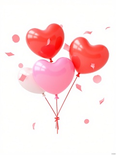 3DYS, Photograph of a cluster of red and pink heart-shaped balloons, with a few white balloons mixed in, floating against a white background. The balloons are glossy and reflective, with a slight shine. There are pink confetti pieces scattered around the balloons, adding a festive touch. The balloons are tied with thin red strings, and some have small, delicate loops at the ends. The overall composition is bright and cheerful, with a sense of celebration and joy. The image has a clean, minimalist aesthetic with a focus on the vibrant colors and playful elements.