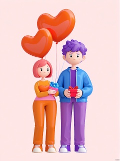 3DYS, A digital illustration featuring a stylized, cartoonish couple standing against a plain, light pink background. The man is holding a bunch of red heart-shaped balloons with a blue jacket and purple pants. The woman is wearing an orange top and matching orange pants, with a small red box in her hands. Both characters have exaggerated, simple features with large heads and small bodies. The overall style is playful and whimsical, with a focus on bright, cheerful colors and a minimalist aesthetic.