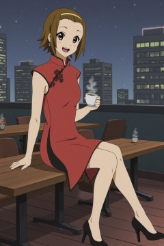 Takai Nakari was wearing a modern and modified version of the cheongsam, which was mainly red and paired with black lace trim. The hem of the skirt was slightly shortened, showing her youthful vitality. The waist design of the cheongsam has hollow details, adding a touch of fashion. Her hair was drifting, she wore a pair of delicate earrings, a pair of black high heels on her feet, a modern art-filled urban rooftop with high-rise buildings with twinkling neon lights and a few stars dotted in the sky. There are several retro tables and chairs on the rooftop, and a cup of steaming tea is placed on the table. Takai Nakaru sat on the edge of the rooftop, his legs swaying gently, holding a cup of tea in his hand, with a naughty smile on his face , eyes full of expectations for the future. Her other hand was casually placed on her knees, showing a casual and confident temperament