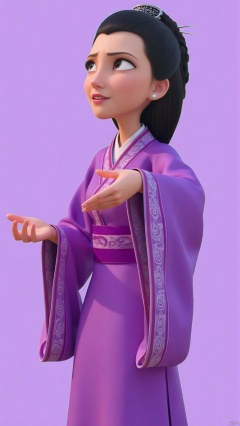 nzyfr,A cartoon drawing of a woman with long black hair tied in a ponytail. She is wearing a purple dress with a purple scarf around her neck. Her hair is pulled back in a bun. Her eyes are blue and her eyebrows are black. Her hands are raised in the air. Her left hand is raised in front of her face. The background is a lavender color.