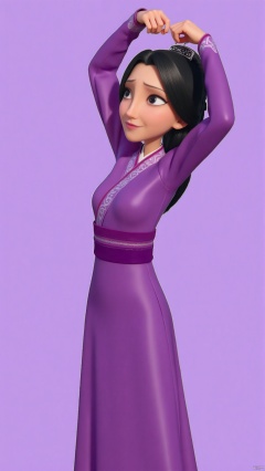nzyfr,A cartoon drawing of a woman with long black hair tied in a ponytail. She is wearing a purple dress with a purple scarf around her neck. Her hair is pulled back in a bun. Her eyes are blue and her eyebrows are black. Her hands are raised in the air. Her left hand is raised in front of her face. The background is a lavender color.