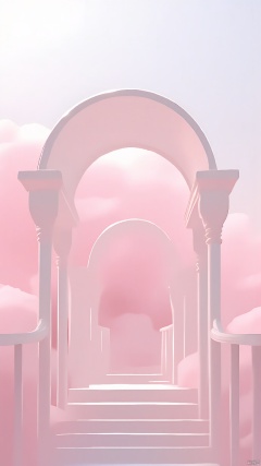 BJYS, Photograph of a surreal, ethereal landscape featuring a white, ornate archway with intricate columns, leading to a staircase ascending into a sky filled with soft, fluffy pink clouds. The archway is illuminated by a gentle, warm light, creating a dreamy atmosphere. The overall color palette is predominantly pink and white, with a soft, pastel aesthetic. The scene is serene and otherworldly, with a sense of calm and wonder.