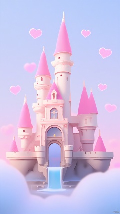 BJYS, A whimsical, pastel-colored illustration of a magical castle with pink towers and spires, surrounded by fluffy clouds and floating hearts. The castle features a grand, circular door at the center, flanked by smaller towers and adorned with intricate details. The sky is a soft gradient of blue and pink hues, enhancing the dreamy atmosphere. The overall style is playful and fantastical, reminiscent of a fairy tale.