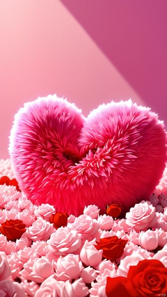 BJYS, Photo of a heart-shaped, fluffy pink plush toy lying on a bed of pink and red rose petals. The plush toy has a soft, velvety texture and is centered in the frame. The background is filled with more rose petals, creating a romantic and whimsical atmosphere. The lighting is soft and diffused, casting gentle shadows and highlighting the plush toy's texture. The overall color scheme is predominantly pink, with subtle variations in shades. The image is high quality and well-composed, with a shallow depth of field that blurs the background slightly, drawing attention to the plush toy.