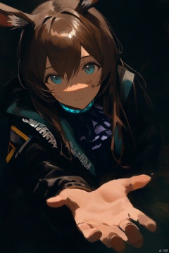 masterpiece, best quality, high score, great score, absurdres, 1girl, amiya \(arknights\), arknights, dirty face, outstretched hand, foreshortening, upper body, dark, dark background, from above, depth of field, faux traditional media, painterly, impressionism, photo background