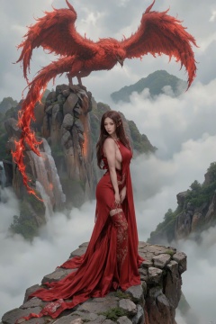 On the top of the mountain that was shrouded in the fog, a woman in a flowing red dress stood sideways. Her beautiful side contour looks more charming in the fans, such as the water of the waterfall gently fluttering with the wind, and the silk shades are smart. Beside her, the figure of the fiery red phoenix was looming, and the wings of the Phoenix fired gently. Every time she waved, she stirred the fog of anime, forming a dreamy vortex. The flames on the Phoenix's body reflected through the fog, reflecting the woman's posture, outlined a mysterious and beautiful picture.,A realistic buxom athletic elven women.,sexy body.,BO-AN1ME,