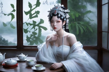 score_9 score_8_up score_7_up,xiqu,1girl, solo, makeup, hair ornament, red lips, indoors, wide sleeves, blurry, black eyes, lips, dress,white dress, realistic,bare shoulders, sitting, tea table, tea cup, Chinese character wall, wide window,green tea cup and teapot on the table.Bamboo leaves are embroidered on the clothes, and bamboo forest outside the window