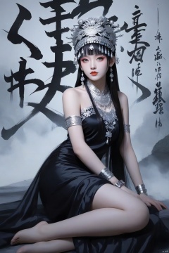 score_9 score_8_up score_7_up,xiqu,1girl, solo, makeup, eye shadow, chinese ethnic minority costumes, long hair, looking at viewer, bangs, black hair, dress, bare shoulders, jewelry, sitting, very long hair, earrings, barefoot, necklace, black dress, bracelet, lips, bare legs, own hands together, armlet, stairs, realistic, red lips