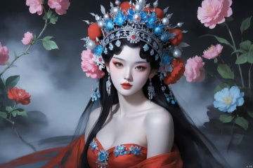 score_9 score_8_up score_7_up,xiqu,1girl, solo, long hair, breasts, looking at viewer, black hair, hair ornament, dress, cleavage, bare shoulders, jewelry, collarbone, upper body, flower, earrings, hair flower, makeup, colored skin, red dress, crown, lipstick, gem, pale skin, red lips