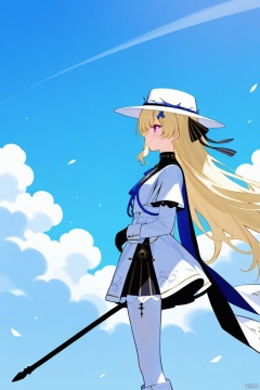 (score_9,score_8_up,score_7_up), (masterpiece),( beautiful),(high quality),(finely detailed),extremely detailed CG unity 8k wallpaper,best quality, 1girl, solo, long hair, smile, bangs, blonde hair, hair ornament, gloves, long sleeves, hat, dress, holding, very long hair, purple eyes, full body, weapon, pantyhose, boots, black gloves, white dress, from side, profile, white headwear, white footwear, white pantyhose,phoebe