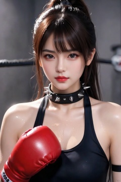 1girl, solo, wet,long hair, looking at viewer, bangs, sweat,brown hair, black hair, closed mouth, upper body, ponytail, spiked collar,spikes, blurry, black eyes, lips, black choker, top, realistic, red lips, red boxing gloves