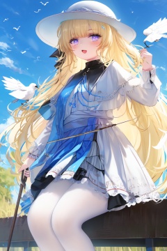 (score_9,score_8_up,score_7_up), (masterpiece),( beautiful),(high quality),(finely detailed),extremely detailed CG unity 8k wallpaper,best quality, 1girl, solo, long hair, looking at viewer, smile, bangs, skirt, blonde hair, shirt, hair ornament, long sleeves, hat, sitting, very long hair, closed mouth, purple eyes, sky, cloud, blue sky, bird, white headwear, white skirt, staff, white pantyhose, blurry foreground, holding staff, dove, white bird,phoebe