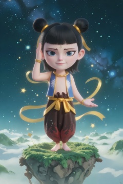 LGNZ, A boy with black hair styled in twin buns, wearing a blue and gold outfit with a blue ribbon tied around his waist, stands proudly on a floating island with stars beneath her feet. he sports a playful smile, blue eyes, and a gold star on his forehead. Gold ribbons twirl around her, and the background showcases a cosmic landscape with shimmering galaxies. The image is a digital illustration in a dreamy, ethereal style.