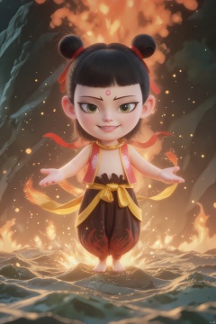 LGNZ, Chinese black and white ink painting,overall illustration style,nezha,A CGI image of a cute,a boy with dark hair in buns,wearing a red and gold outfit with a sash,and red ribbons flowing around her. he has a wide,toothy grin and a small red dot on her forehead. His feet are on fire,the background is a towering flame,under my feet are rolling giant waves,