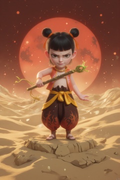 LZNZ, Digital illustration of a fierce, young warrior with a curious and adventurous smile. His short black hair is styled into two high buns tied with orange ribbons. he wears an orange and brown outfit that mimics the texture of leather, paired with yellow and brown desert-patterned pants. he wields a long, staff made of twisted vines, standing on a platform of shifting sands. The background is a vast, golden desert under a blood-red sunset, evoking a sense of exploration and mystery. The art style is rugged and vivid, with a desert fantasy theme.