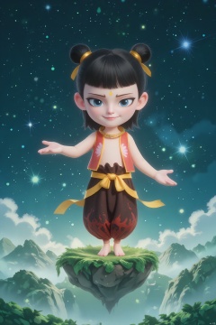 LZNZ, A boy stands proudly on a floating island with stars beneath her feet. he sports a playful smile, blue eyes, and a gold star on his forehead. Gold ribbons twirl around her, and the background showcases a cosmic landscape with shimmering galaxies. The image is a digital illustration in a dreamy, ethereal style.