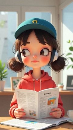 A girl sits confidently in a well-lit studio setting, wearing a peaked cap and sleek headphones. The feature article she's reading is spread out on a nearby desk, with a cup of coffee or notebook nearby. Her facial expression conveys focus and absorption in the material. The overall composition is clean and modern, with a subtle background that adds depth to the scene without distracting from the subject.cartoon style