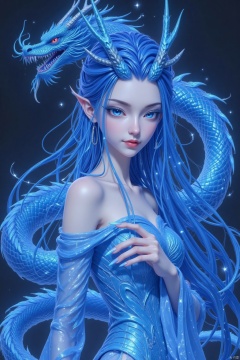 Against a dark blue background, a confident young girl with piercing blue eyes and vibrant blue hair stands solo, her long locks flowing down her back. Her gaze is cast downward, her mouth curved upward in a subtle smile. Exaggerated nails on her fingertips gleam with an electric blue hue that matches the color of her hair. A majestic dragon hovers above her, its scales shimmering with a mesmerizing iridescence. The girl wears an off-the-shoulder dress with intricate details, rendered in stunning 4K resolution. In this masterpiece, every brushstroke seems to pulse with life, as if the ink painting style has been infused with digital magic. Perfect for a high-resolution wallpaper, this artwork exudes a sense of wonder and enchantment.
