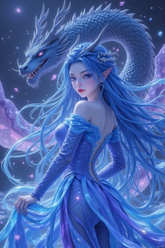 A solo girl stands confidently with a full-body shot, her piercing blue eyes gazing down as her lips curve upward in a subtle smile. Her long blue hair flows behind her like a river of night, adorned with exaggerated nail polish in shimmering hues. The off-the-shoulder dress clings to her curves, its color shifting from blue to purple in the light. A majestic dragon hovers above her, its scales glinting like jewels as it surveys the scene. Rendered in stunning 4K resolution, this masterpiece of a digital artwork is an ultra-detailed feast for the eyes, with every brushstroke and texture painstakingly crafted by masterful CG artists using an ink painting style that defies reality.