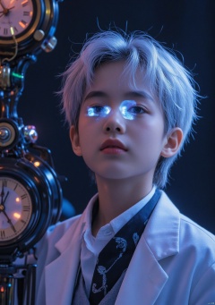 Detailed hair, detailed eyes, immersive background, absurdres, masterpiece, best quality, high resolution, 4k, perfect illustration, detailed art style, looking at viewer, 1boy, lu_guang,white hair,black eyes,white shirt,open clothes,collared shirt,black shirt, from_below, dramatic lighting, neon lighting, clock