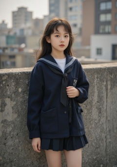 WALLPER, masterpiece:1.2),best quality,high resolution,unity 8k wallpaper,(illustration:1),perfect lighting,extremely detailed CG,finely detail,extremely detailed,soft lighting and shadow,soft yet striking lighting,film grain:1.2,(skin pores:1.2),(detailed skin texture:1),((solo:1.5)),Detailed face,(see-through:1.1),misty,Low Key:1.1,depth of field, A woman in a sailor suit stands confidently amidst an urban backdrop,her gaze directed off to one side.,