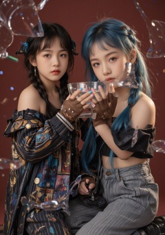 1girl, long hair, looking at viewer, bangs, blue eyes, multiple girls, gloves, holding, 2girls, bare shoulders, very long hair, blue hair, purple eyes, braid, teeth, striped, pants, tears, fingerless gloves, pink eyes, nail polish, twin braids, crop top, tattoo, red background, pink nails, brown gloves, blue nails, reflection, mirror, asymmetrical bangs, glass, broken glass, striped pants, jinx \(league of legends\)