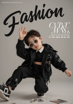 Head up shot, low angle shot of an 11 year old girl wearing a black trendy jacket dancing, dynamic posture, lifting one hand, perfect fingers, one foot off the ground, wearing white sunglasses, trendy magazine background, with the text "Fashion" in the background, creating a magazine cover like visual effect