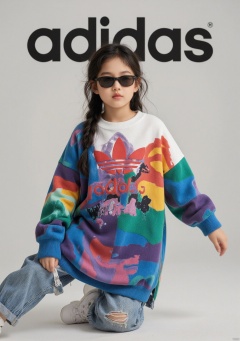 A cute little girl wearing a colorful Adidas sports sweatshirt, in a dynamic posture, wearing black sunglasses, with the text "Adidas" in the background. The trendy photography technique creates a visual effect similar to a magazine cover