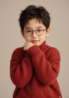 a little boy,wearing glasses and a red sweater with a smile on his face and arms folded over his shoulders, Byeon Sang-byeok, childish, a photocopy, toyism, portrait photography