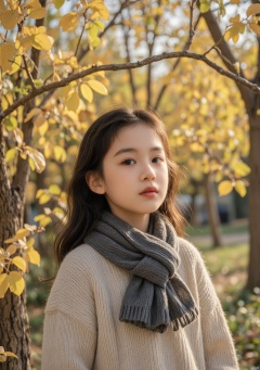 a little girl wearing a scarf and a sweater in the fall with a tree in the background and a yellow leafy tree in the foreground,Chen Jiru,a stock photo,art and language,autumn,