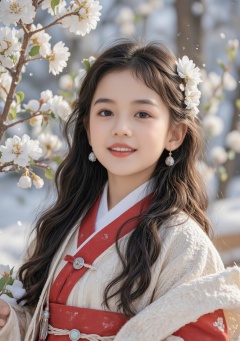 A little girl with long black hair adorned with white flowers on the side of her head, wearing a red and white Hanfu garment in front of a snowy scene, smiling with a happy expression. She has delicate facial features, exquisite makeup, and is wearing white earrings hanging from her shoulders. She is also wearing a red cloak with a small silver decoration around the neck. The full-body photographs are in a realistic photographic style, with a snowy scene background and soft light shining through the leaves.