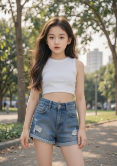 Full length photo of a stunning 14-year-old Asian girl with long, flowing light brown hair and radiant clear pale skin. slim childish body, petite body, slim, cute face, female child. wide angle. Her captivating brown eyes draw the viewer in, while her elegant yet approachable vibe is highlighted by her obediant posture. Natural light enhances her youthful glow, emphasizing her obediant and gentle personality. Her pose is natural, exuding grace and charisma, with a serene expression that captures her inner beauty. She wears a casual yet stylish outfit, consisting of a fitted white crop top that subtly accentuates her slim, toned figure. Paired with high-waisted denim shorts, the outfit gives off a relaxed, effortless vibe, perfect for the warm, outdoor setting. The distressed edges of the shorts add a touch of laid-back style, while the soft sunlight highlights her youthful, glowing skin and graceful pose. The setting is a tranquil park with trees casting dappled shadows on the ground, and a gentle breeze moving through the air. The warm sunlight creates a golden glow, and the peaceful environment adds to the calm atmosphere, emphasizing her natural beauty and serene confidence. The photo captures a quiet moment of relaxation, with the city skyline in the distance providing a subtle contrast to the peaceful park setting.