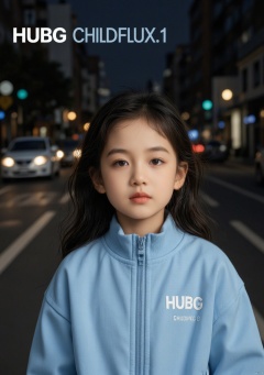 A medium shot of a girl in a light blue jacket. The jacket has a zipper on the front and a white HUBG logo on the right side. The girl has dark brown hair and blue eyes. She is standing in front of a backdrop of a city street. There are cars driving on the street. The background is dark and blurred. The word "HUBG ChildFlux.1" is written in bold white letters at the top of the image.