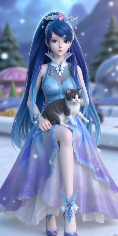 Zhang's realistic and surreal portraits show a 3D character landscape. A girl is holding a cat and looking at the audience. The background is a small snow-covered village and ski resort. The scene includes pine trees and a small figure skiing on the snow-covered ground, captured in a dreamy film style, and the soft and fuzzy snowfall creates a quiet winter atmosphere. The composition adopts natural global illumination to enhance the sense of magical reality. The image was presented in ultra-detail and ultra-high resolution in 4D, and was shot with Fuji color film aesthetics. With the help of the 85mm f/1.4 lens on the DSLR camera, it captures the essence of a fantastic and story-rich micro-world, integrates macro art with vivid colors, and brings fascinating and realistic visual experience. Whole body, long hair, sitting posture, highest quality, exquisite CG, water drops on hair, beautiful goddess, close-up, exquisite face, exquisite lips, exquisite eyes, exquisite nose, a girl.