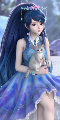 The close-up of Zhang's realistic and surreal portraits shows a 3D character landscape. A girl holds a cat and stares at a small snow-covered village and ski resort. The scene includes pine trees and a small figure skiing on the snow-covered ground, captured in a dreamy film style, and the soft and fuzzy snowfall creates a quiet winter atmosphere. The composition adopts natural global illumination to enhance the magical realism. The image was presented in ultra-detail and ultra-high resolution in 4D, and was shot with Fuji color film aesthetics. With the 85mm f/1.4 lens on the DSLR camera, it captures the essence of a fantastic and story-rich micro-world, blends macro art with vivid colors, and brings fascinating and realistic visual experience. Whole body, long hair, sitting posture, highest quality, exquisite CG, water drops on hair, beautiful goddess, close-up, exquisite face, exquisite lips, exquisite eyes, exquisite nose, a girl.