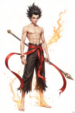 solo, black hair, red eyes, 1boy, holding, jewelry, full body, weapon, male focus, barefoot, bracelet, abs, fire, polearm, staff