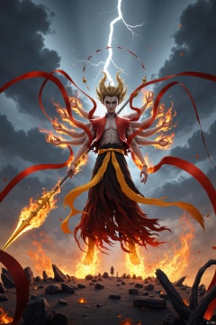 Nezha stands victorious on a ravaged battlefield, where shattered rocks and broken weapons scatter amidst dark clouds crackling with lightning. His dragon-scale armor glistens in the dim light as he brandishes his fire-tipped spear and universe circle. The triple-headed, six-armed giant's imposing form is bathed in an aura of power, as wind-fire wheels spin beneath his feet, igniting flames that dance around him like golden-red halos.